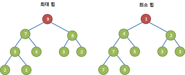 - 완전 이진 트리의 일종으로 우선순위 큐를 위하여 만들어진 자료구조