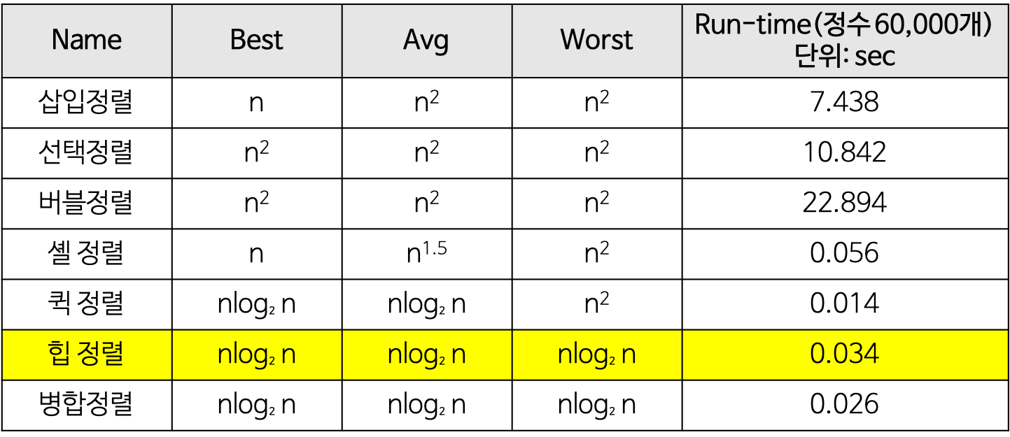 힙 정렬은 추가적인 메모리를 전혀 필요로 하지 않는다. 또한 최악의 경우 O(N^2)의 성능을 내는 퀵 정렬과는 다르게 항상 일정한 성능을 발휘하므로 최소한의 알고리즘만 정의할 경우 힙정렬이 가장 안정적인 성능을 갖는다.