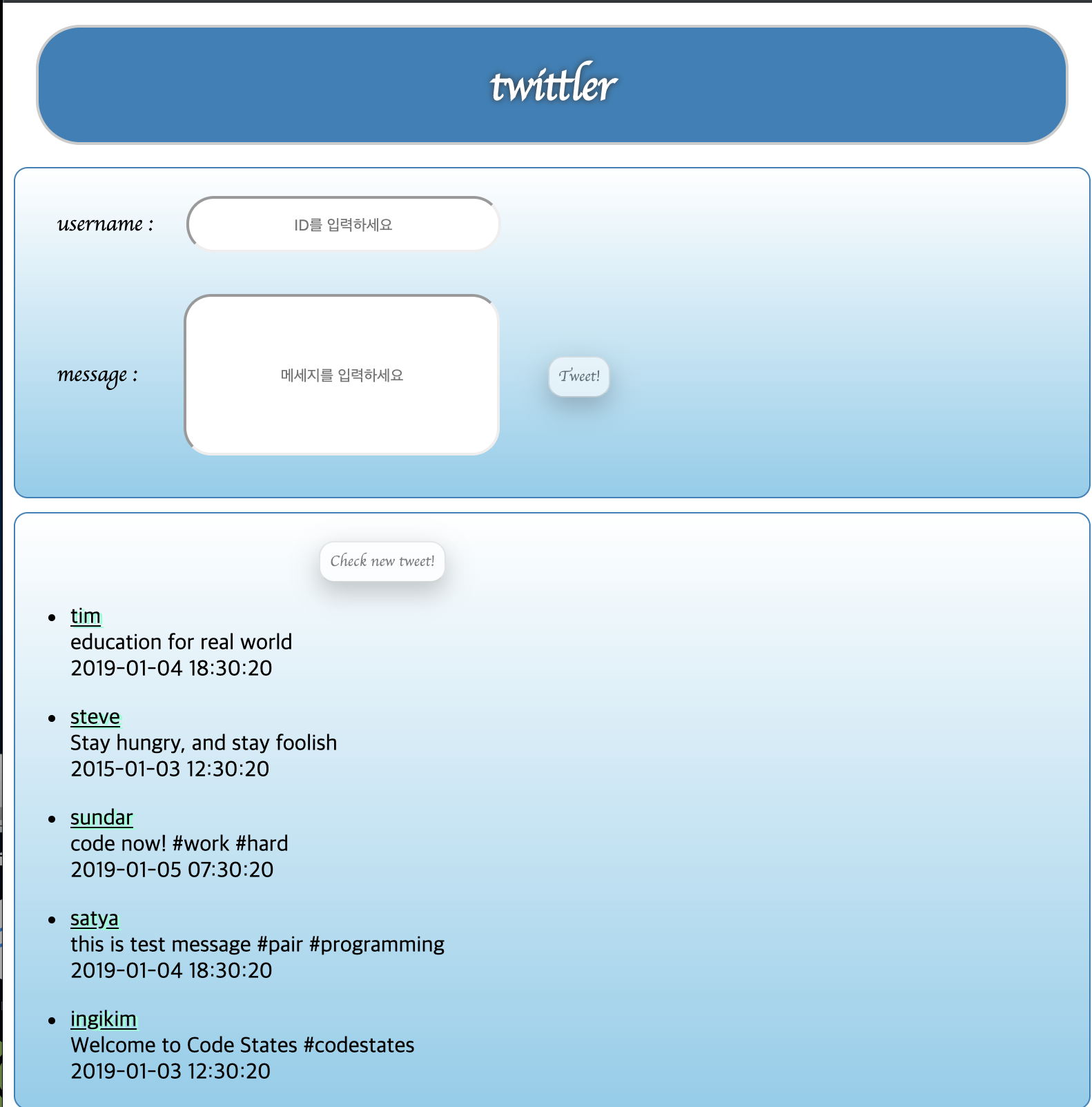soloweek를 지나고서부터는 눈에보이는 html, css를 배우면서 여태 배운 javascript(+DOM) 를 활용해 twittler를 만들게되었다