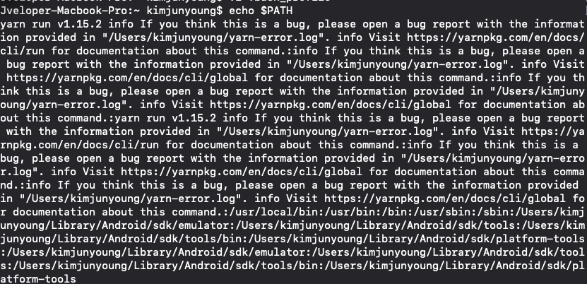 그런데 echo $PATH를 쳐봤을때 뭔가 yarn에서 error가 나고있다는걸 파악할 수 있었다