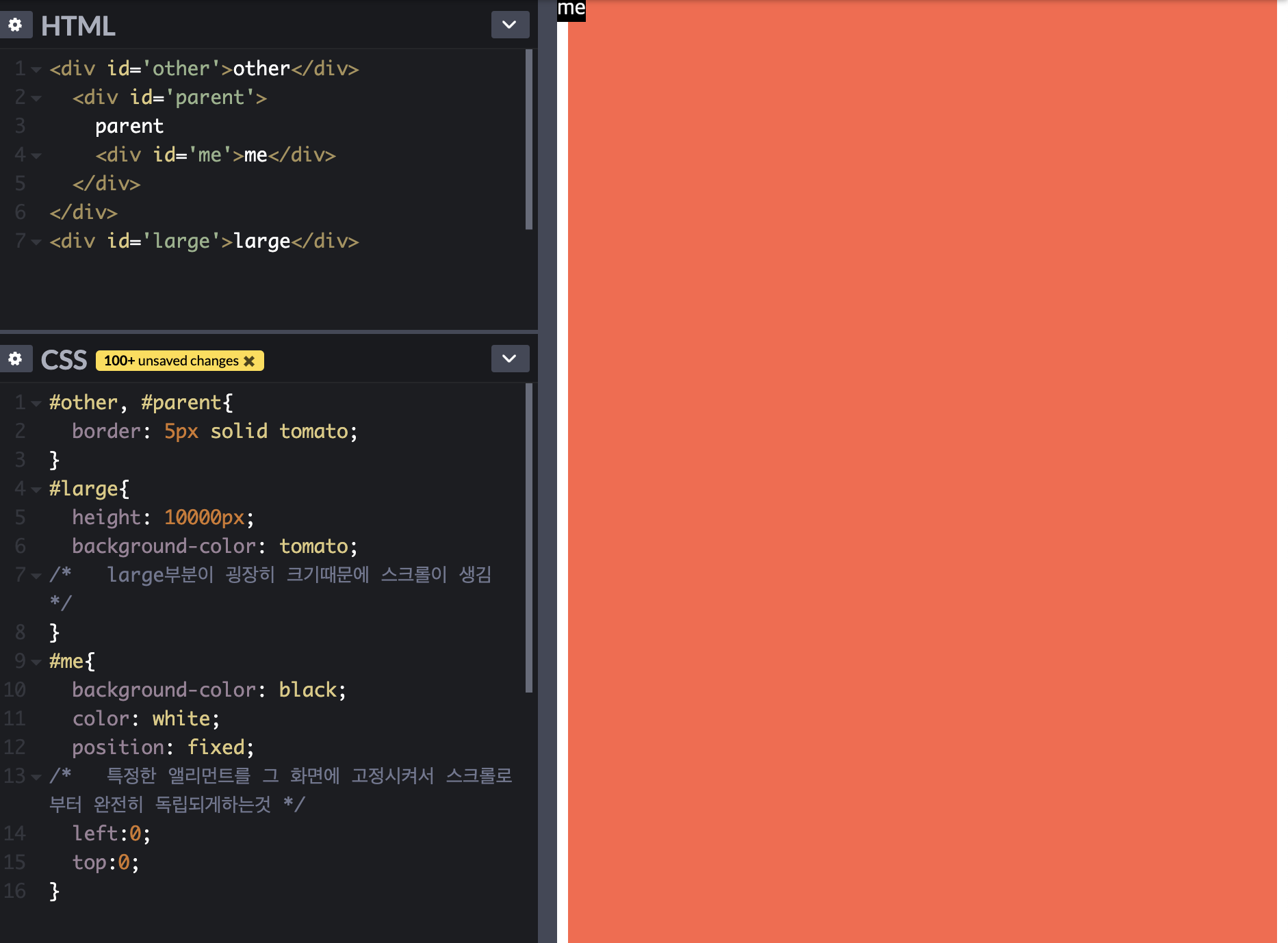 absolute(절대적) : html element 웹페이지의 제일 가장자리에 있는 경계에 있는 태그인 html element를 기준으로 위치를 정하고싶을때