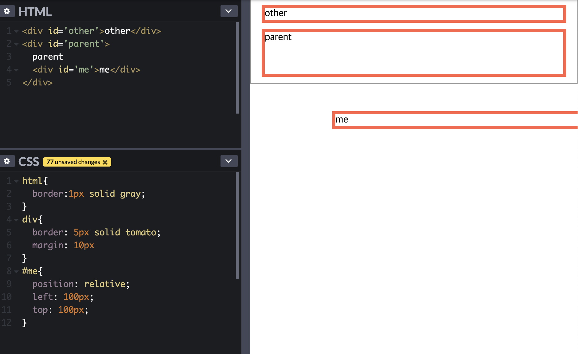 #grand의 기본값을 relative로 줬기때문에 #grand를 기준으로 #me가 움직인다(left:0, top:0)