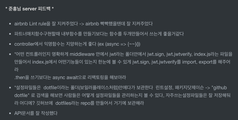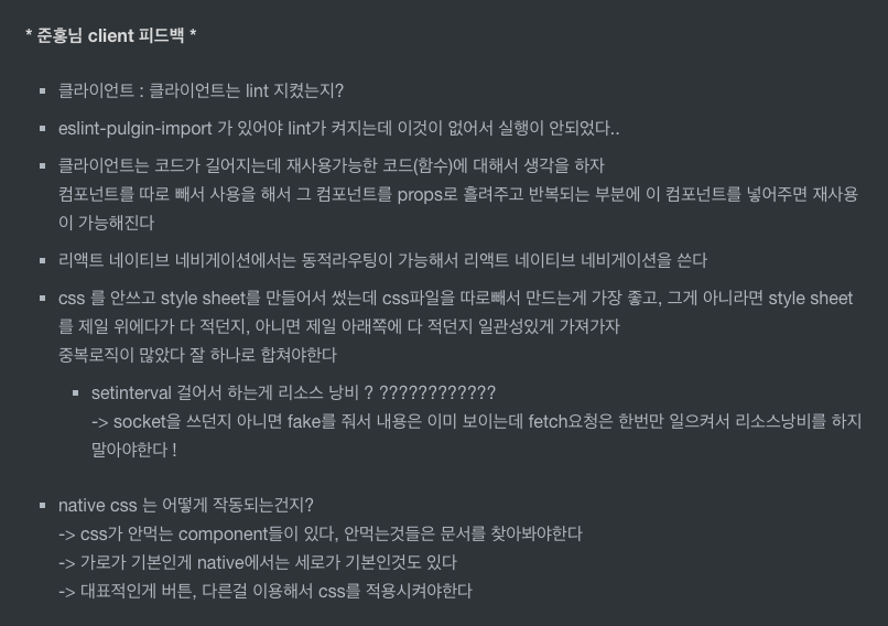 피드백(내가 뭘 했는지?, server피드백, client피드백, 전체적인 프로젝트리뷰, 팀원들 느꼈던점)