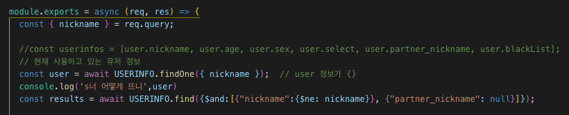 여기서 $ne를 통해서 현재 나의 닉네임은 제외하고 $and를 통해서 그리고, 나머지의 모든값을 가져온다라는 의미로 사용이 된것같다