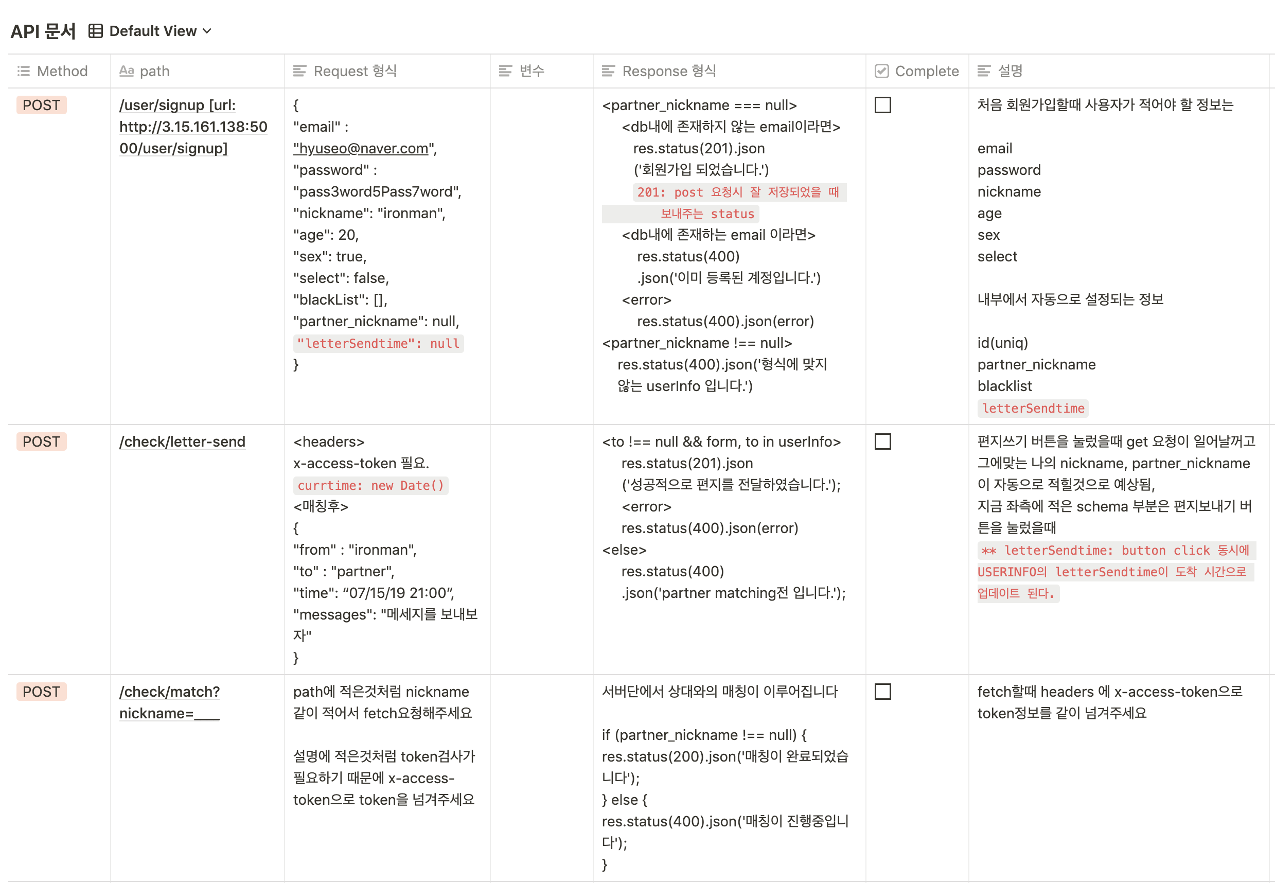 이 부분은 칭찬을 받았던 부분인데 API문서를 구체적으로 잘 작성했다고 해주셨다 ! 앞으로는 RESTful하게 적어보자
