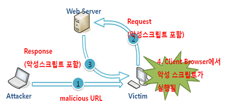 - 이 취약점은 웹 애플리케이션이 사용자로부터 입력 받은 값을 제대로 검사하지 않고 사용할 경우 나타난다. 주로 여러 사용자가 보게 되는 전자 게시판에 악성 스크립트가 담긴 글을 올리는 형태로 이루어진다.