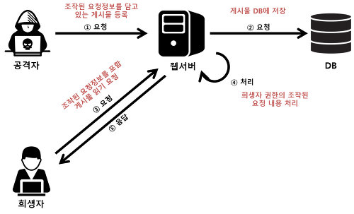 웹사이트 취약점 공격의 하나로, 사용자가 자신의 의지와는 무관하게 공격자가 의도한 행위(수정, 삭제, 등록 등)를 특정 웹사이트에 요청하게 하는 공격을 말한다.