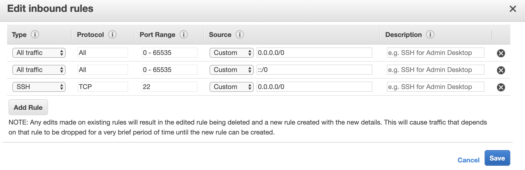 3. 인바운드 설정을 all traffic & anywhere(누구나 접근가능하게) 로 열어준다