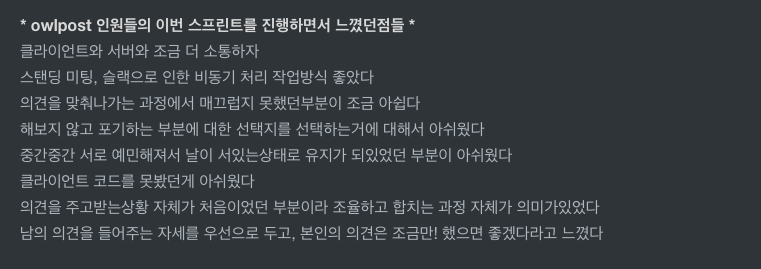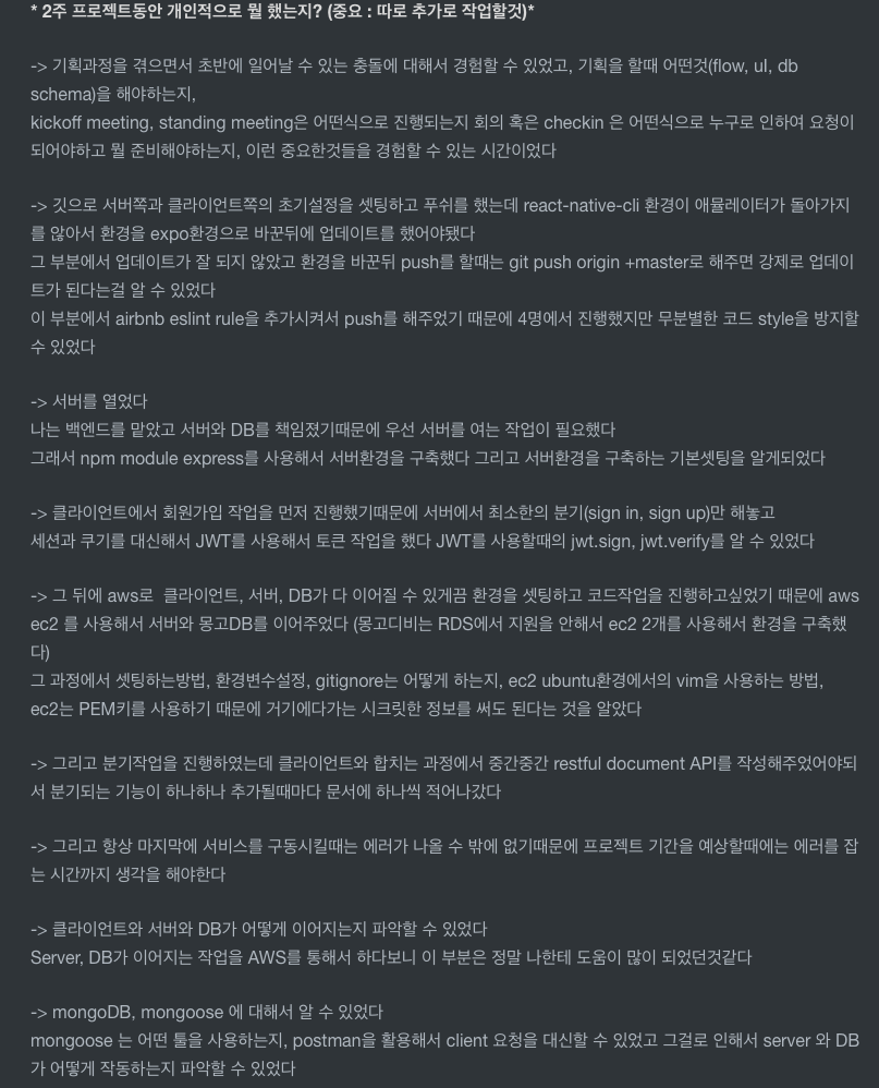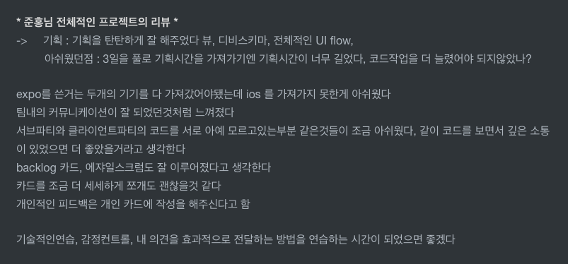 피드백(내가 뭘 했는지?, server피드백, client피드백, 전체적인 프로젝트리뷰, 팀원들 느꼈던점)