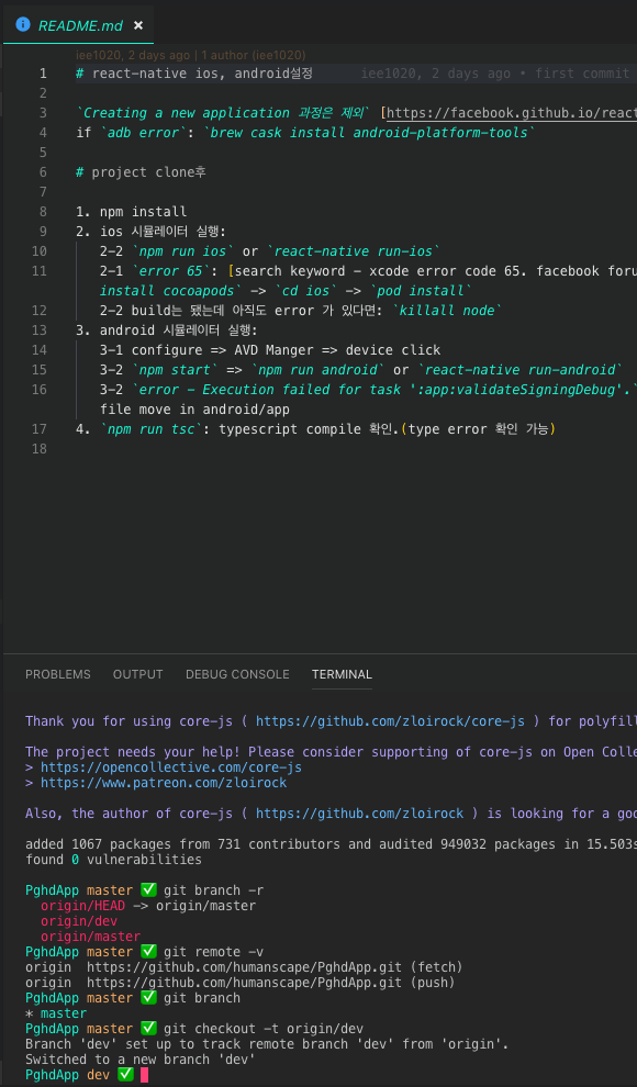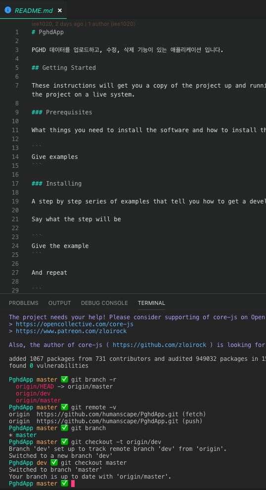 master branch는 clone할때 받아왔고, dev branch도 받아오고 싶을경우 아래처럼 쓰인다