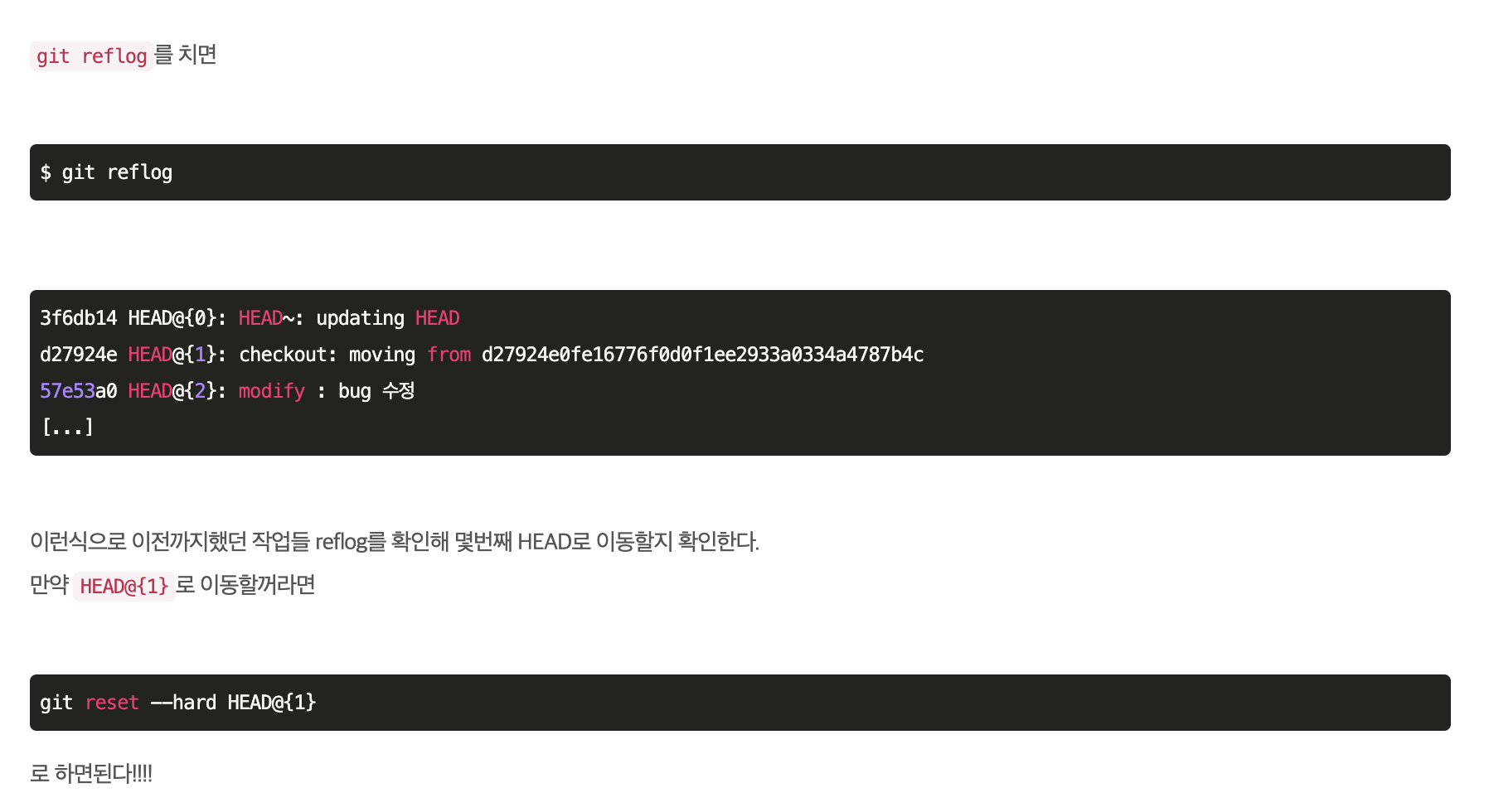 log를 확인할 수 있었다 그 이후에 git reset --hard HEAD@{1} 를 작성하면 {} 이 안의 숫자에 따라 내가 원하는 곳으로